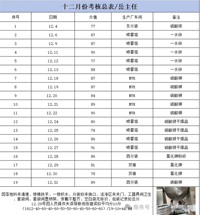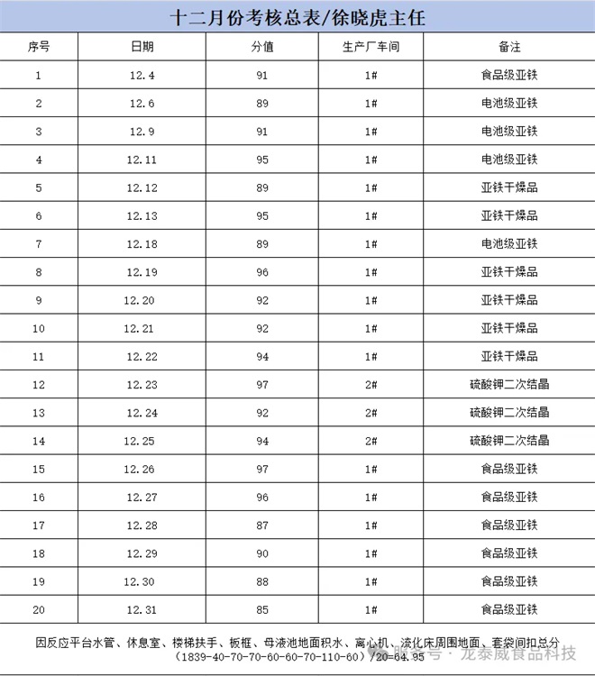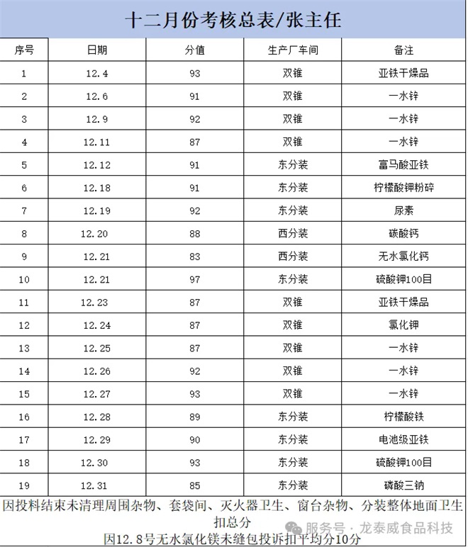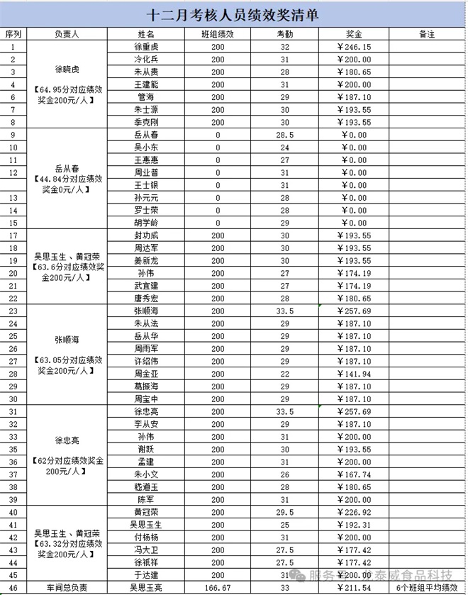 龙泰威(江苏)食品科技有限公司12月份优秀班组考核结果出炉! 为夯实生产管理基础,规范现场操作流程,营造整洁高效、安全有序的生产环境,进一步激发各班组的责任意识与协作活力,公司依据各生产线考核标准,于12月份完成了对全公司多条生产线班组的综合考核工作。 经综合考核评定,徐重虎主任1#2#生产线班组荣获12月份“优秀生产班组”称号! 该班组在本次考核中表现突出,全生产线环境卫生整洁有序,设备维护到位,各项操作流程规范严谨,生产记录详实准确,充分展现了高效协作的团队风貌和扎实的责任意识,是全体班组学习的榜样。 公司将对该优秀班组予以表彰奖励,希望其珍惜荣誉、再接再厉,持续发挥标杆引领作用,带动更多班组提升管理水平。 ![]() 本次考核也清晰呈现了各生产线的提升空间:1#生产线需加强休息室地面清洁及栏杆粉尘清理;3#生产线要重点优化板框压滤机平台卫生及设备周边粉尘管控;双锥生产线需规范投料后杂物清理及套袋间管理;2#生产线需及时清理特定区域积水。 在此号召全体班组以优秀班组为标杆,对照考核标准精准查摆不足,积极落实整改措施。公司将持续推进常态化、精细化班组考核,以考核促提升、以规范保质量,凝聚团队合力,共同推动公司生产管理工作再上新台阶! 2025年12月份绩效奖金公示 本次考核围绕环境卫生、标识管理、生产记录、原辅料领用四大核心维度,进行了全面、细致的核查评分。现将考核绩效奖金公示如下: